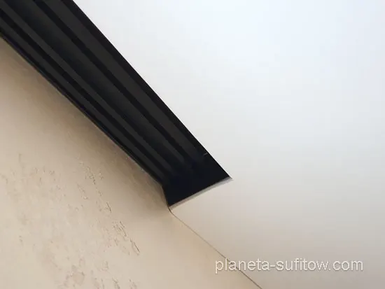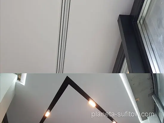 Gotowe karnisze dostępne są w dwóch rozmiarach 2 metry i 3,2 metra długości, ale możemy połączyć profile i zrobić karnisz 5-6 metrów. Oferujemy również karnisz wpuszczany w kolorze białym i czarnym. Ponieważ profil-karnisz jest wbudowany w płaszczyznę sufitu napinanego, sufit jest obniżony o 6-7 cm w stosunku do betonowego. Główną zaletą takiego karniszu sufitowego - jest możliwość wbudowania w nią oświetlenia LED.