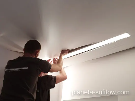 Jest to całkowicie wyjątkowa i do niedawna niemożliwa opcja projektowania sufitu. Taka konstrukcja, gdy światło wychodzi zza folii, a przy zgaszonym, sufit jest po prostu idealnie równy, jest możliwe tylko w technologii sufitów napinanych. Aby stworzyć świecące paski LED, odpowiednia jest tylko specjalna półprzezroczysta folia, która przy wyłączonym świetle wygląda jak białe matowe płótno, a po włączeniu idealnie przepuszcza większość światła przez siebie.Ledy na suficie nadaje się do oświetlania pomieszczeń o niskiej wysokości sufitu, ponieważ przy takim oświetleniu absolutnie nie jest konieczne stosowanie żyrandola lub innych lamp, które zakryją wysokość. W tym przypadku sufit opada aż o 4 cm!